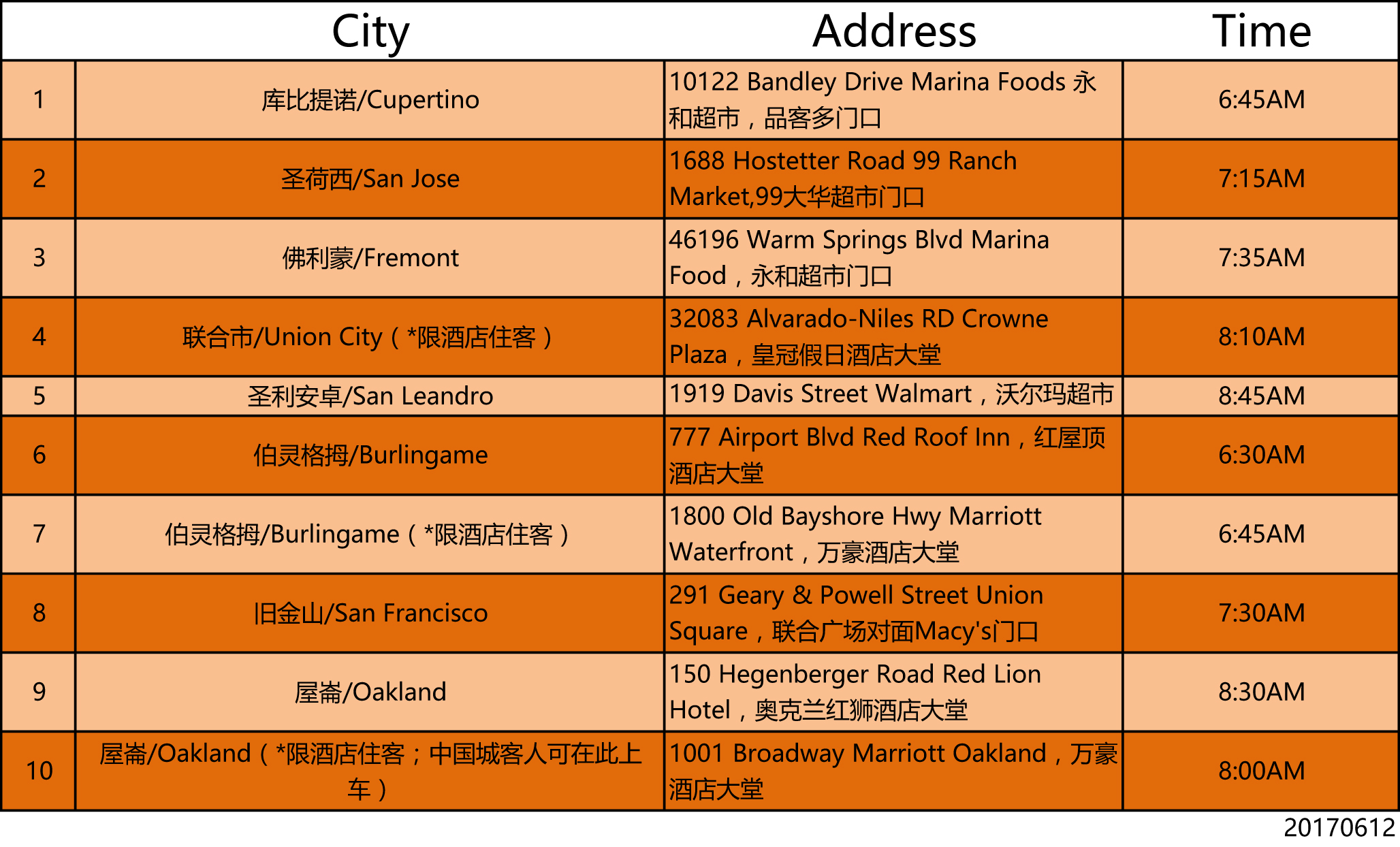 (薩克拉門托上車地點為州政府塔樓門口,集合時間為11點)